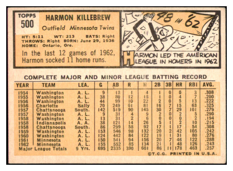 1963 Topps Baseball #500 Harmon Killebrew Twins VG-EX 529197