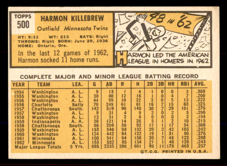 1963 Topps Baseball #500 Harmon Killebrew Twins VG-EX 545569