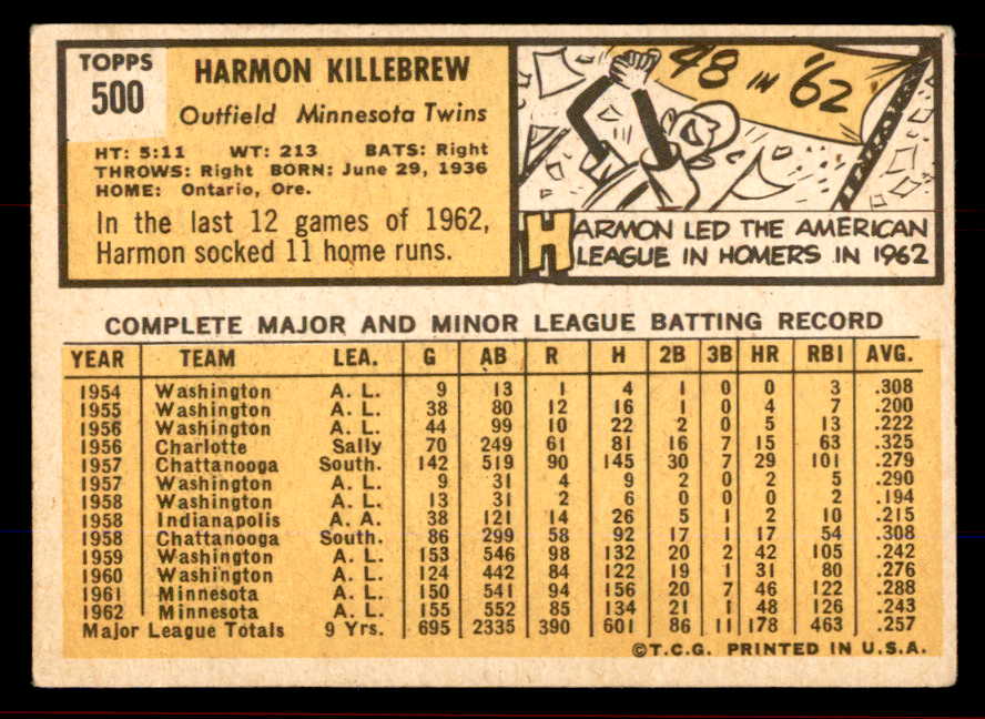 1963 Topps Baseball #500 Harmon Killebrew Twins VG-EX 545691