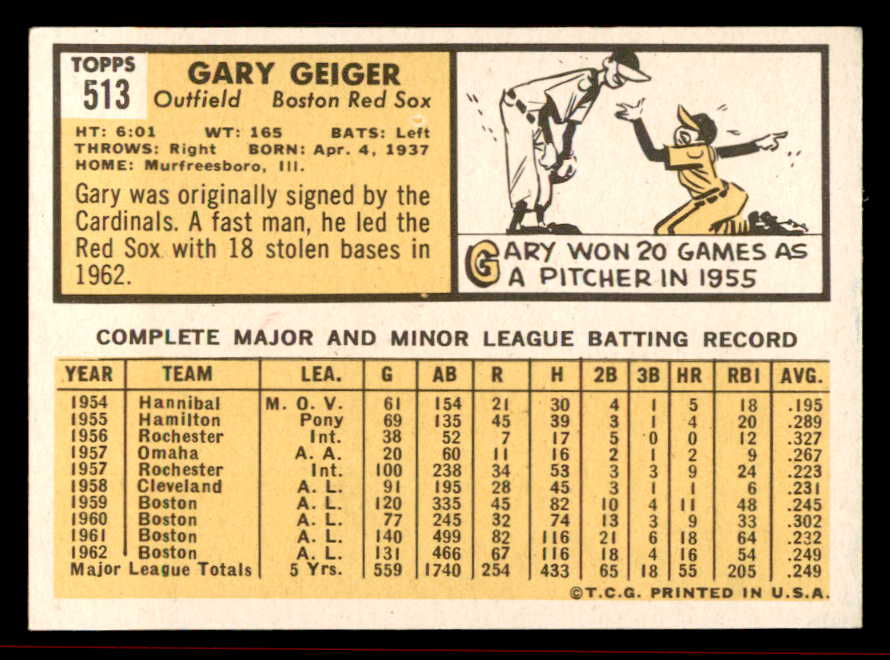 1963 Topps Baseball #513 Gary Geiger Red Sox NR-MT 542878