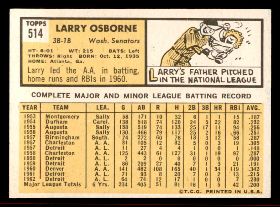 1963 Topps Baseball #514 Larry Osborne Senators NR-MT 542879