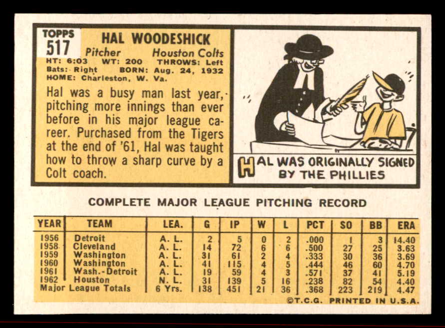 1963 Topps Baseball #517 Hal Woodeshick Colt .45s NR-MT 542882