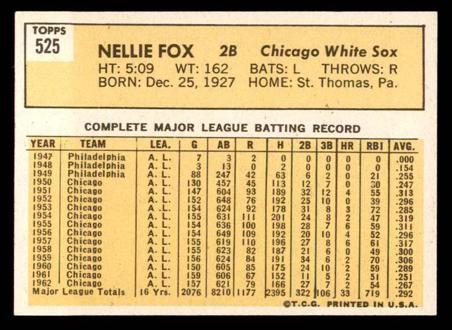 1963 Topps Baseball #525 Nellie Fox White Sox NR-MT 540563