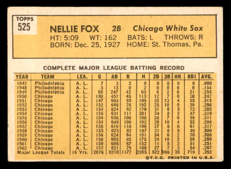 1963 Topps Baseball #525 Nellie Fox White Sox VG-EX 540562
