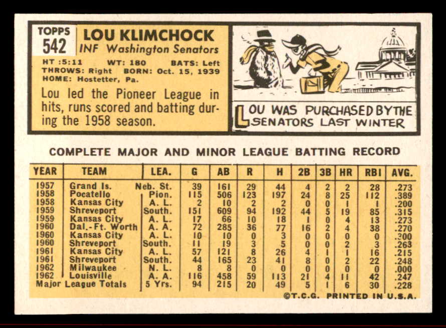 1963 Topps Baseball #542 Lou Klimchock Senators NR-MT 542901