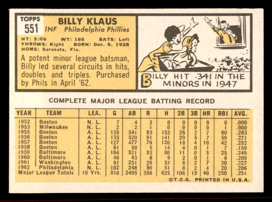 1963 Topps Baseball #551 Billy Klaus Philles NR-MT 542907