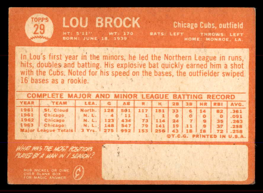 1964 Topps Baseball #029 Lou Brock Cubs EX+/EX-MT 545830