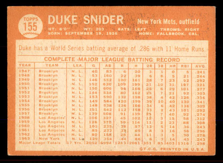 1964 Topps Baseball #155 Duke Snider Mets EX 545813