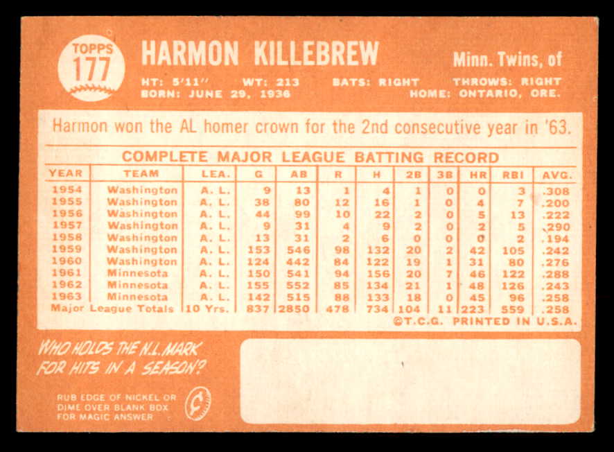 1964 Topps Baseball #177 Harmon Killebrew Twins NR-MT 547617