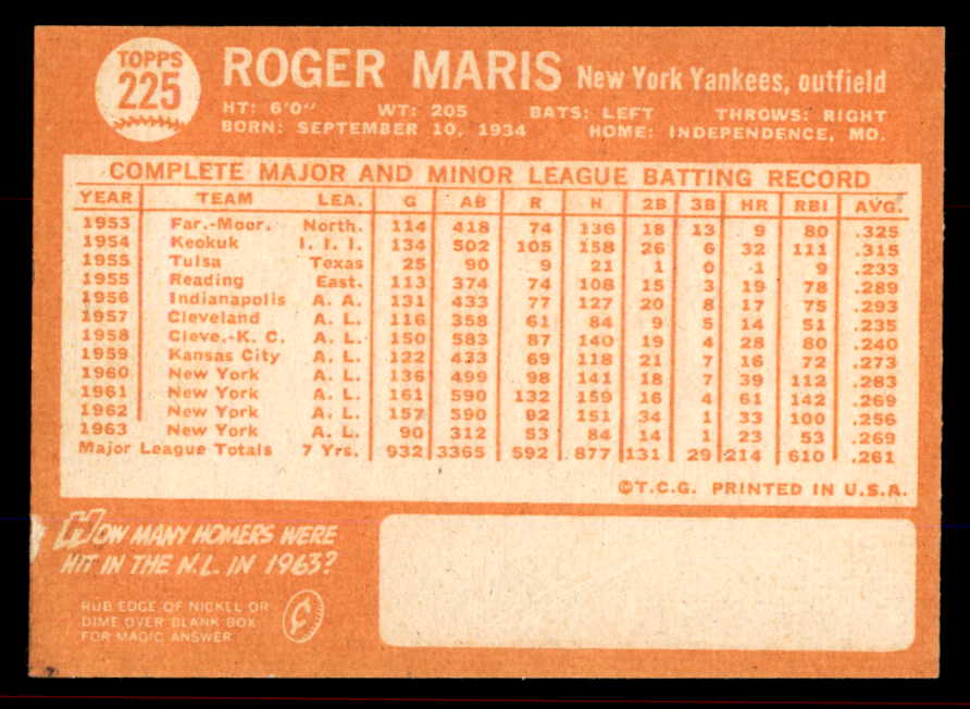 1964 Topps Baseball #225 Roger Maris Yankees EX-MT 545842