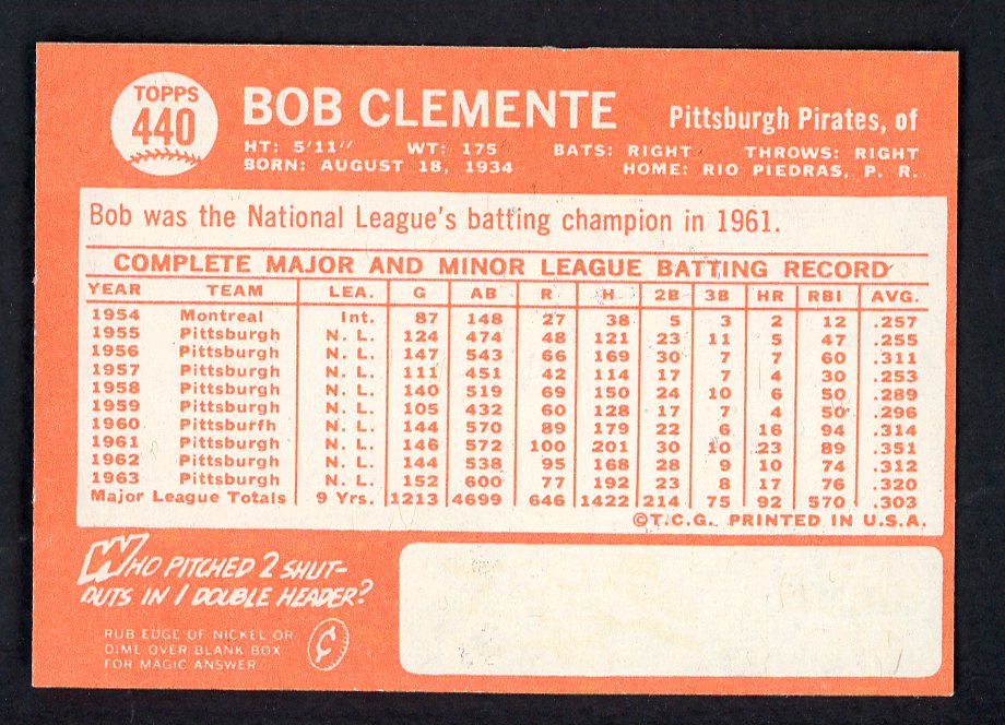 1964 Topps Baseball #440 Roberto Clemente Pirates EX-MT 546961