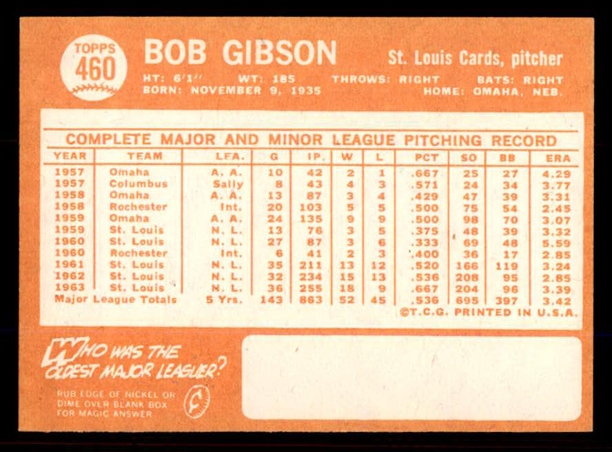 1964 Topps Baseball #460 Bob Gibson Cardinals NR-MT 545453