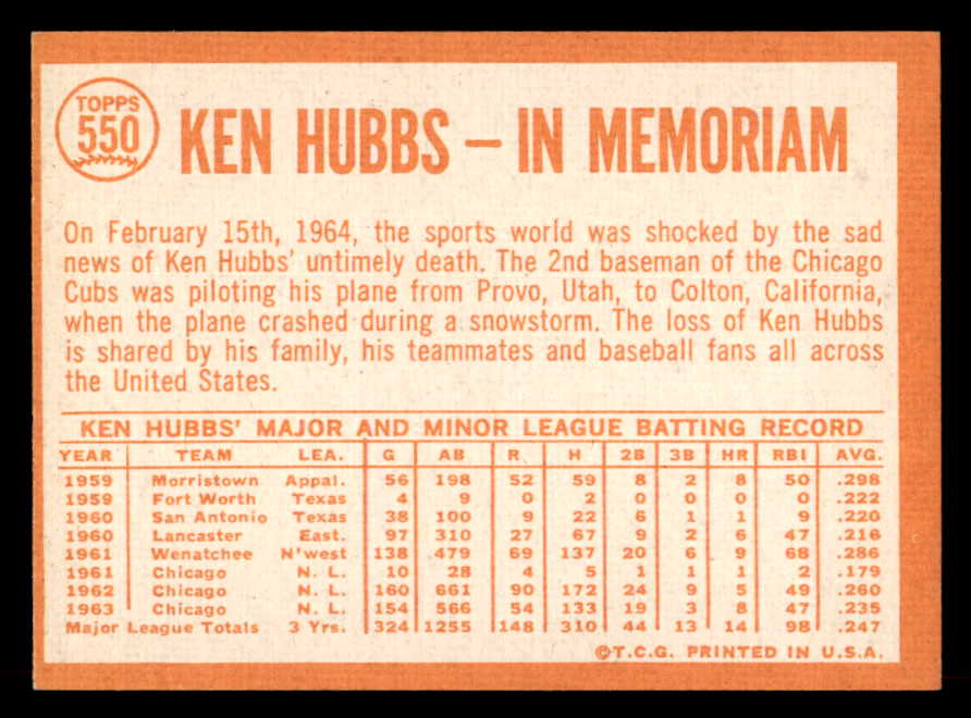 1964 Topps Baseball #550 Ken Hubbs Cubs EX-MT 546711