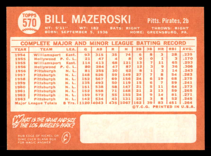 1964 Topps Baseball #570 Bill Mazeroski Pirates EX-MT 546712