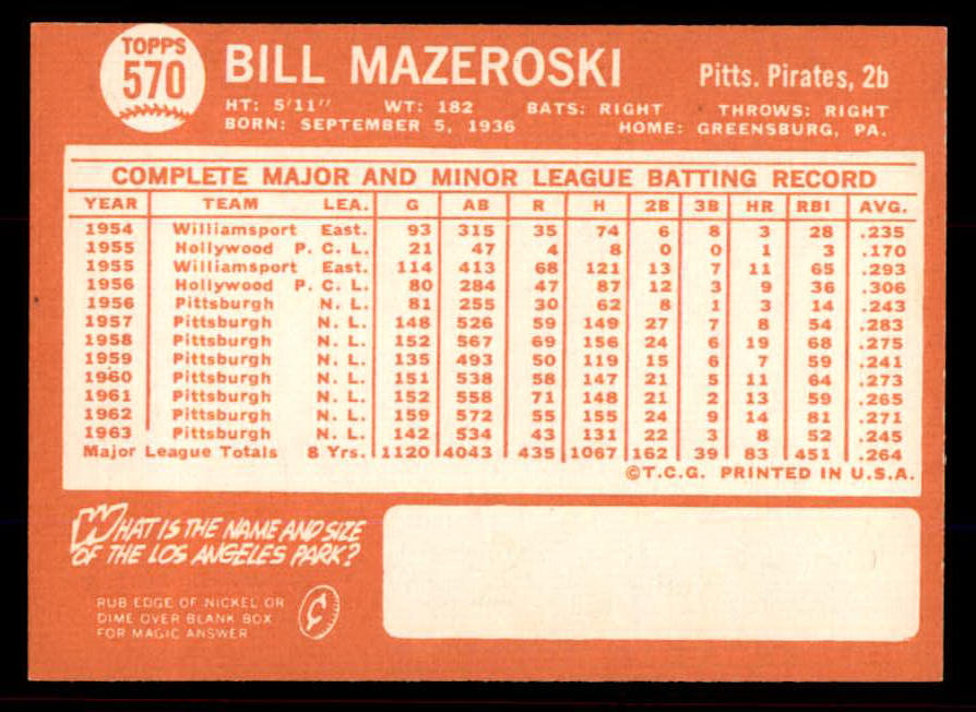 1964 Topps Baseball #570 Bill Mazeroski Pirates NR-MT 545448
