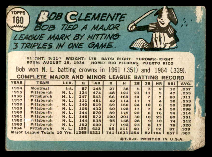 1965 Topps Baseball #160 Roberto Clemente Pirates FR-GD 544610