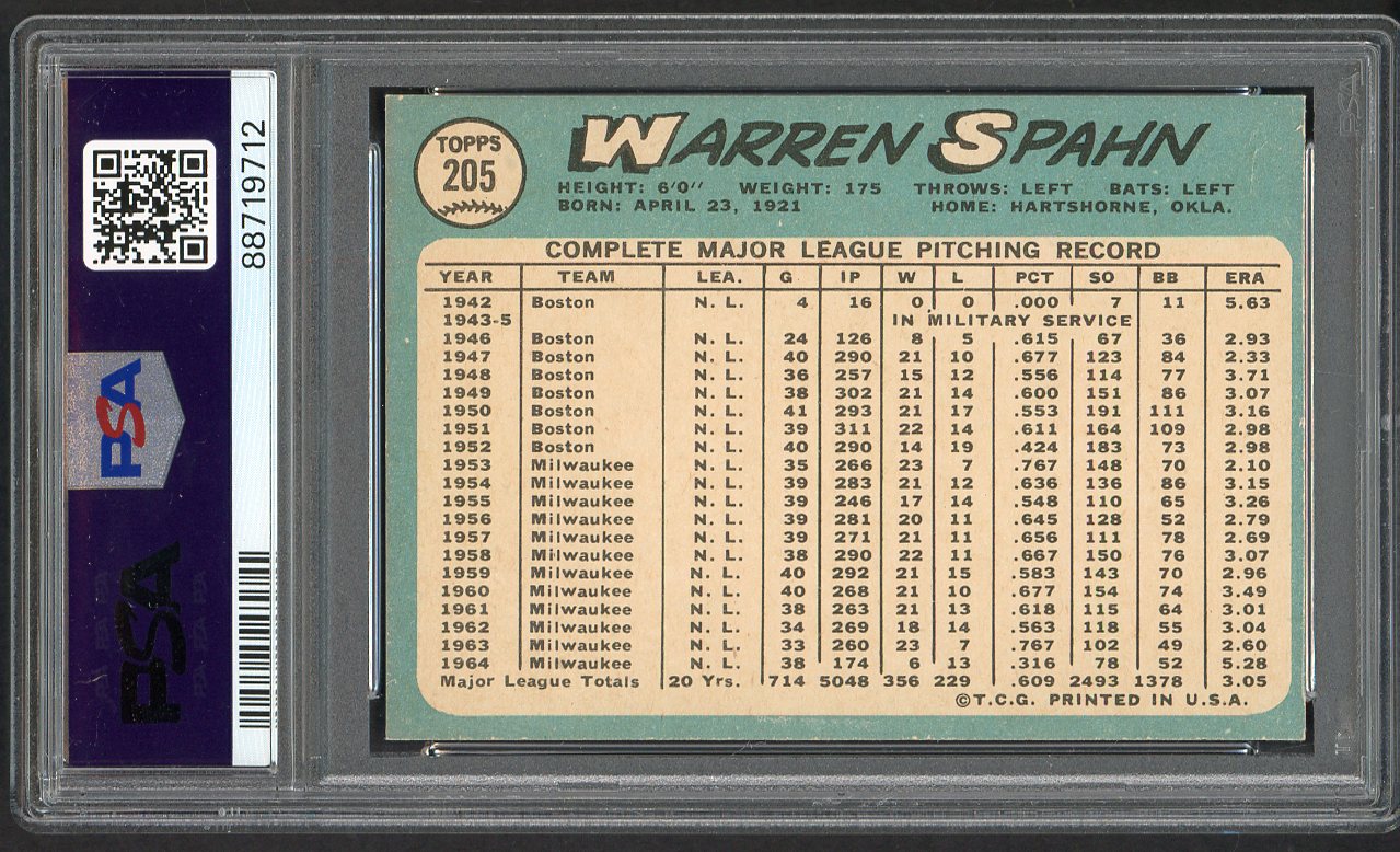 1965 Topps Baseball #205 Warren Spahn Mets PSA 7 NM 545305