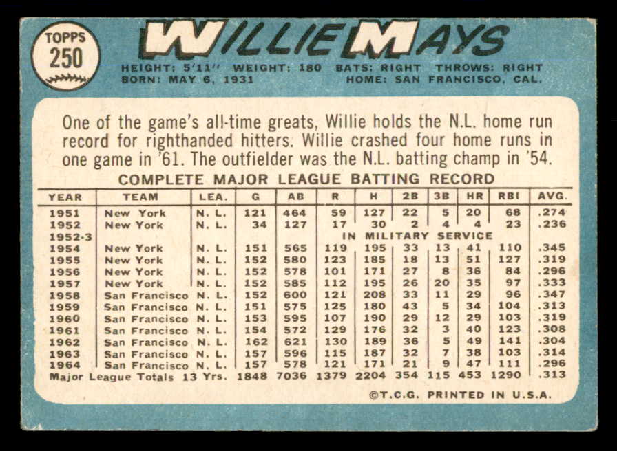 1965 Topps Baseball #250 Willie Mays Giants VG-EX 540815