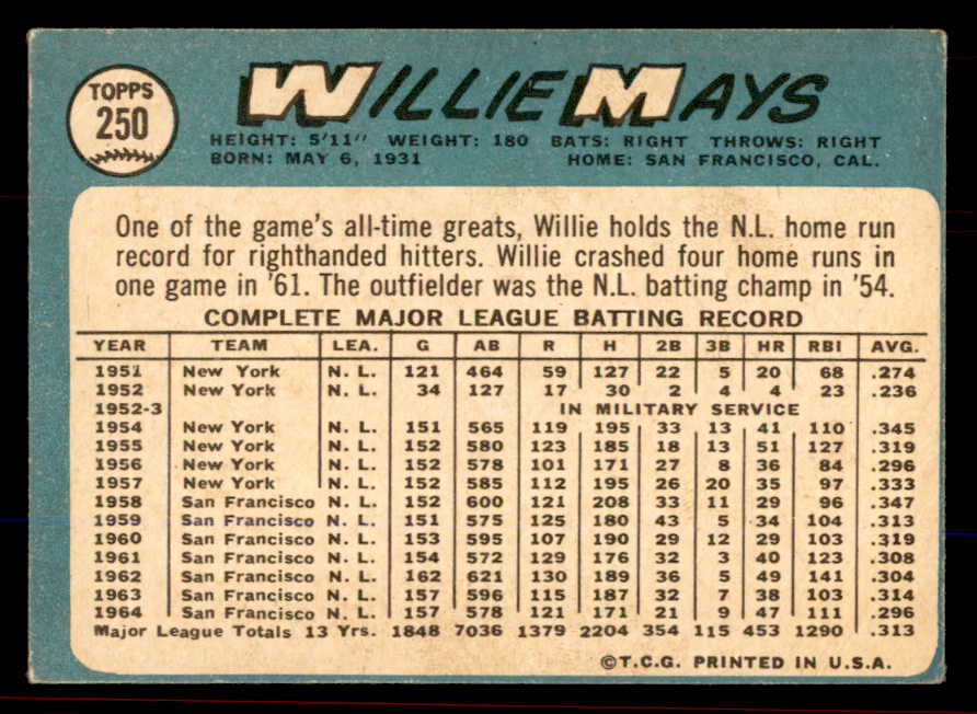 1965 Topps Baseball #250 Willie Mays Giants VG-EX 545674