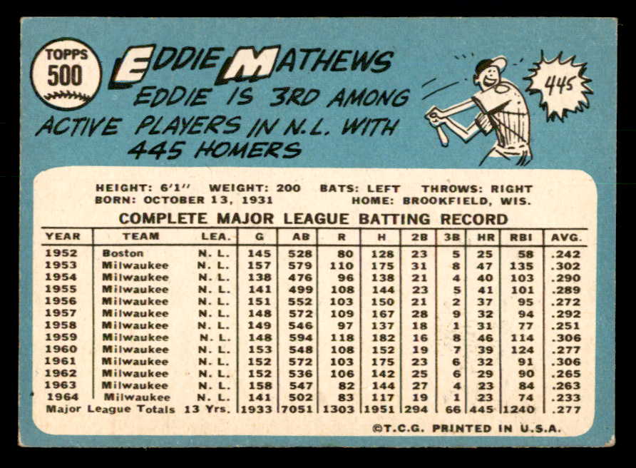 1965 Topps Baseball #500 Eddie Mathews Braves EX 540771