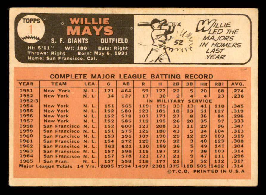 1966 Topps Baseball #001 Willie Mays Giants VG-EX 547066