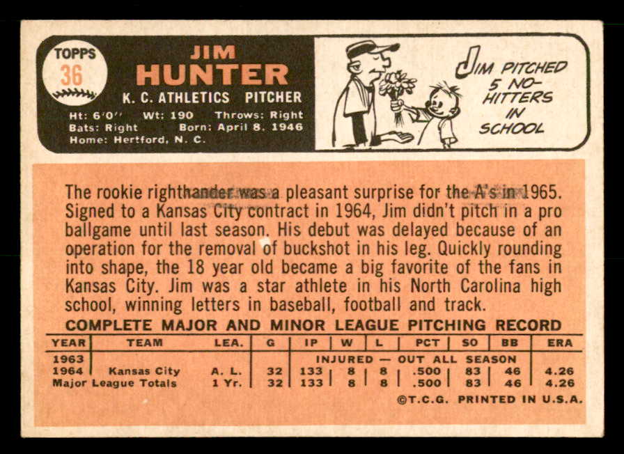 1966 Topps Baseball #036 Catfish Hunter A's EX-MT 539756