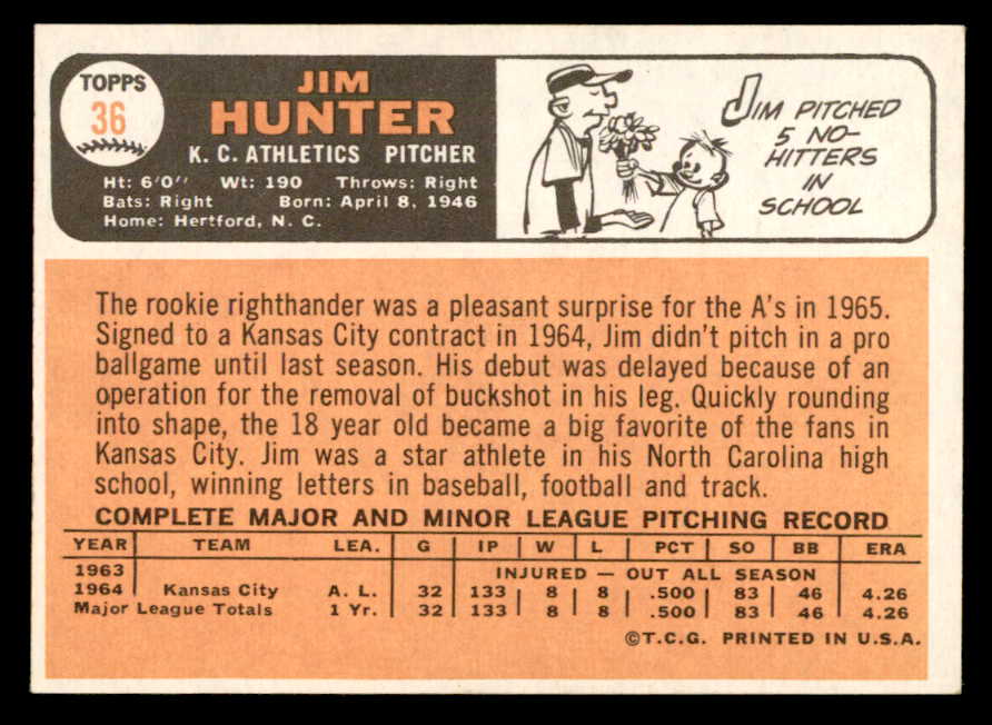1966 Topps Baseball #036 Catfish Hunter A's EX-MT 547067