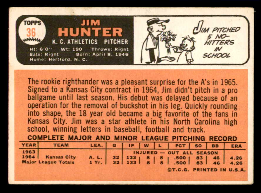1966 Topps Baseball #036 Catfish Hunter A's VG 540889