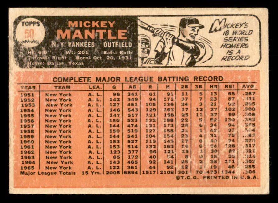 1966 Topps Baseball #050 Mickey Mantle Yankees GD-VG 540908