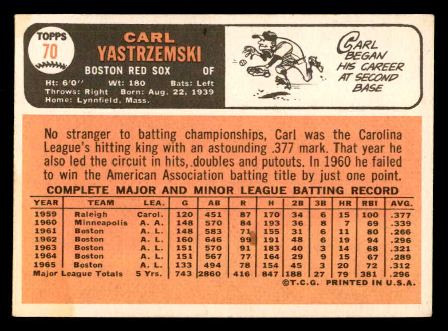 1966 Topps Baseball #070 Carl Yastrzemski Red Sox VG-EX 540852