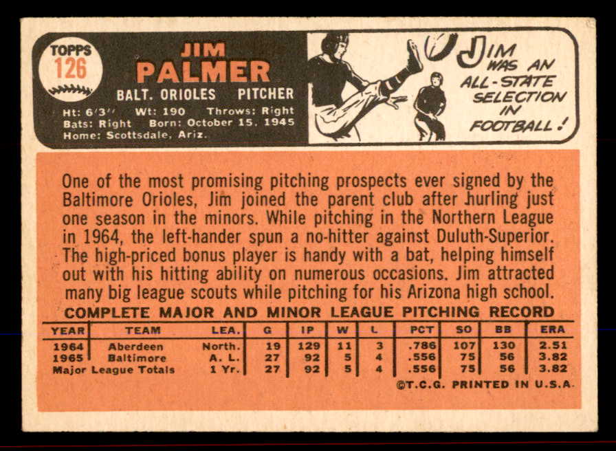 1966 Topps Baseball #126 Jim Palmer Orioles EX+/EX-MT 545548