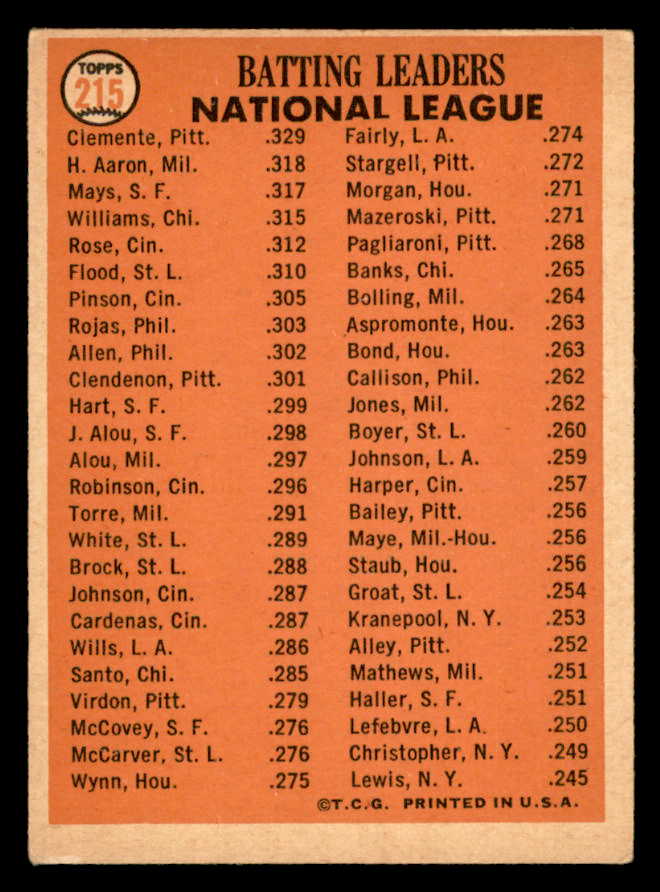 1966 Topps Baseball #215 N.L. Batting Leaders Clemente Aaron Mays EX-MT 547073