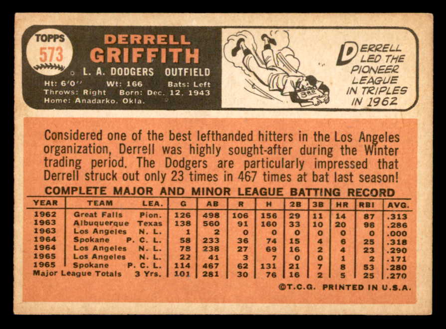 1966 Topps Baseball #573 Derrell Griffith Dodgers EX 544513