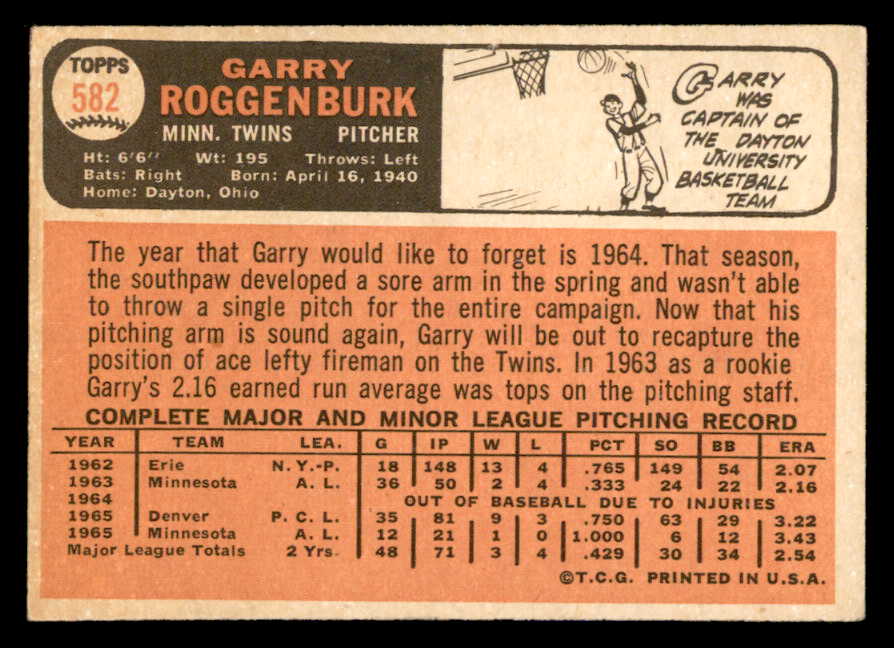 1966 Topps Baseball #582 Garry Roggenburk Twins EX 544529