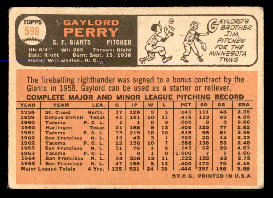 1966 Topps Baseball #598 Gaylord Perry Giants VG 547884