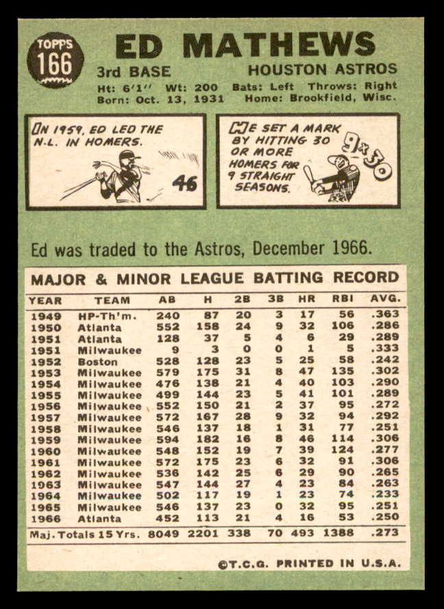 1967 Topps Baseball #166 Eddie Mathews Braves EX-MT 546257