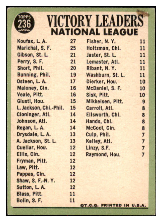 1967 Topps Baseball #236 N.L. Win Leaders Sandy Koufax VG-EX 531187