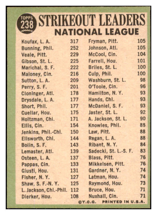 1967 Topps Baseball #238 N.L. Strike Out Leaders Sandy Koufax VG-EX 530488