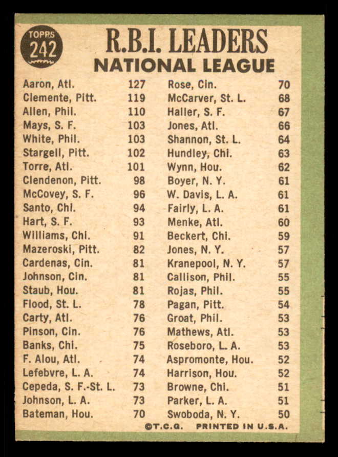 1967 Topps Baseball #242 N.L. RBI Leaders Aaron Clemente Mays EX-MT 543274