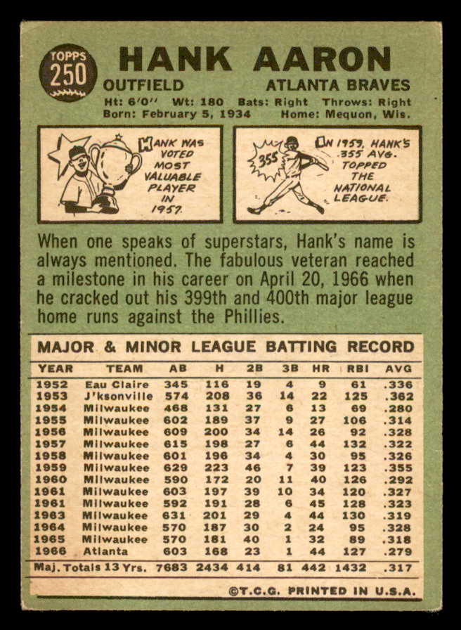 1967 Topps Baseball #250 Hank Aaron Braves EX 539213