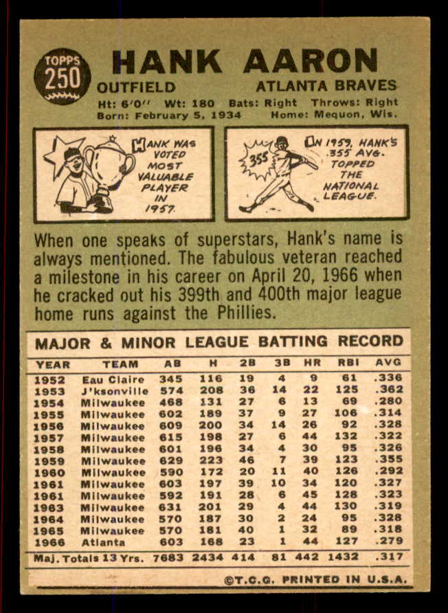 1967 Topps Baseball #250 Hank Aaron Braves VG 545769