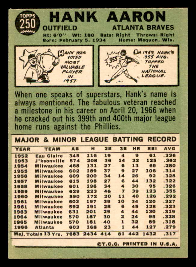 1967 Topps Baseball #250 Hank Aaron Braves VG-EX 546261