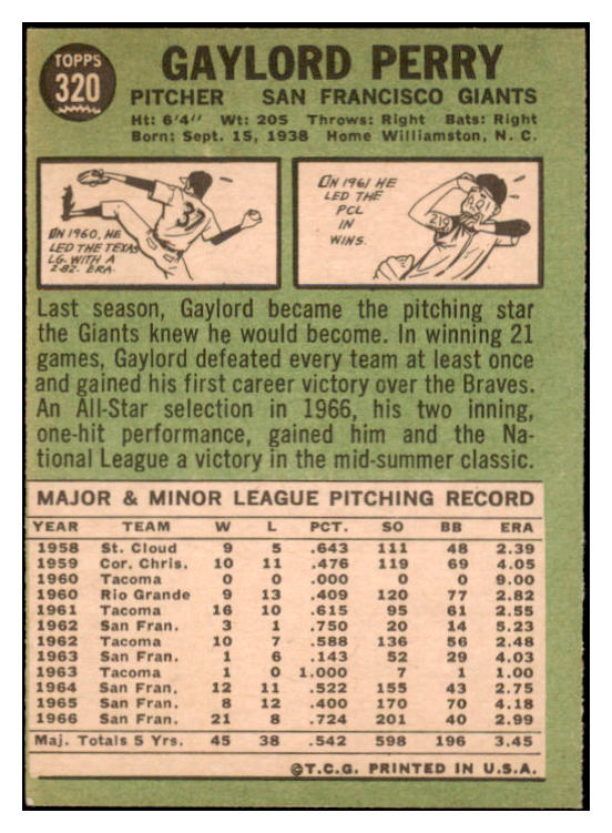 1967 Topps Baseball #320 Gaylord Perry Giants EX-MT 529207