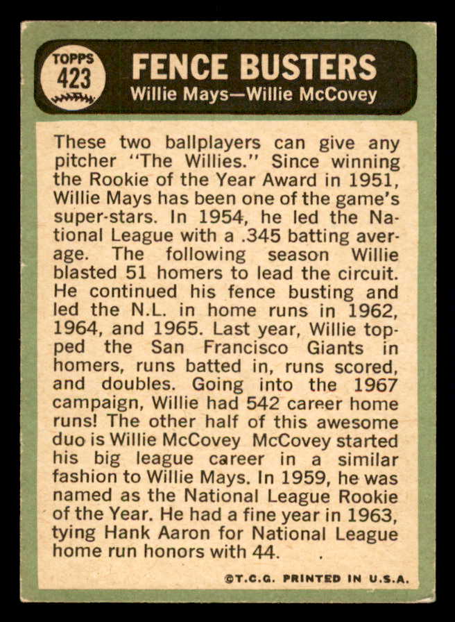 1967 Topps Baseball #423 Willie Mays Willie McCovey EX 540956