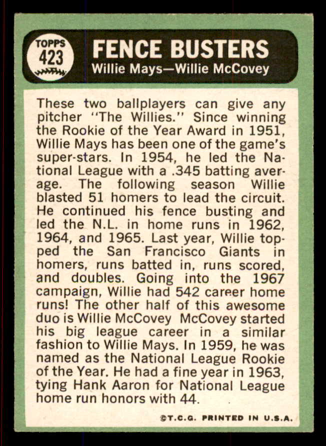 1967 Topps Baseball #423 Willie Mays Willie McCovey EX-MT 545802