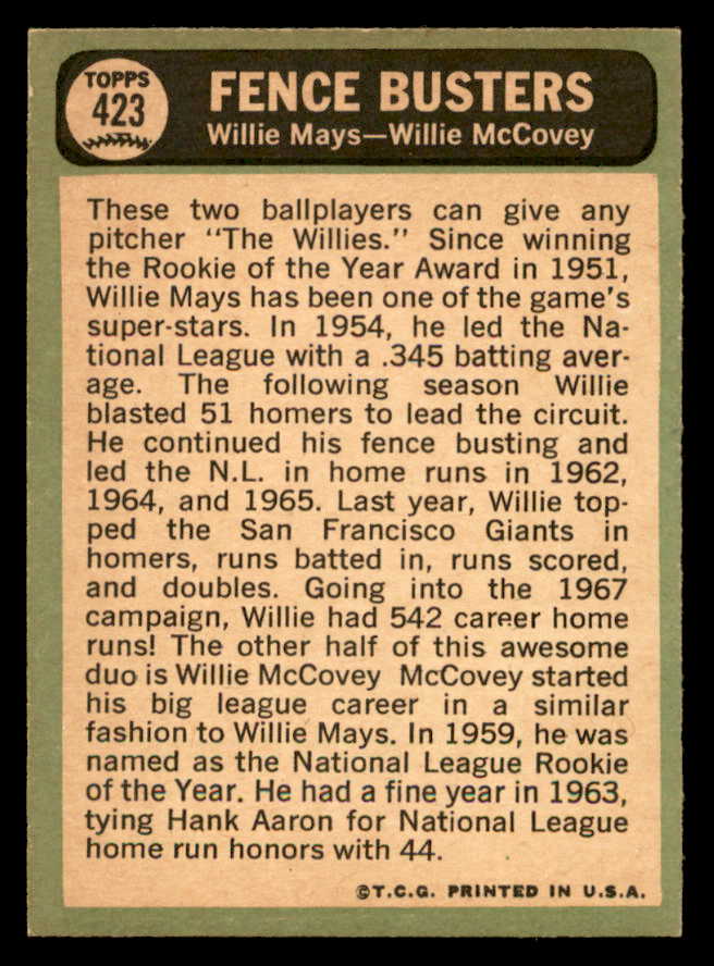 1967 Topps Baseball #423 Willie Mays Willie McCovey NR-MT 546273
