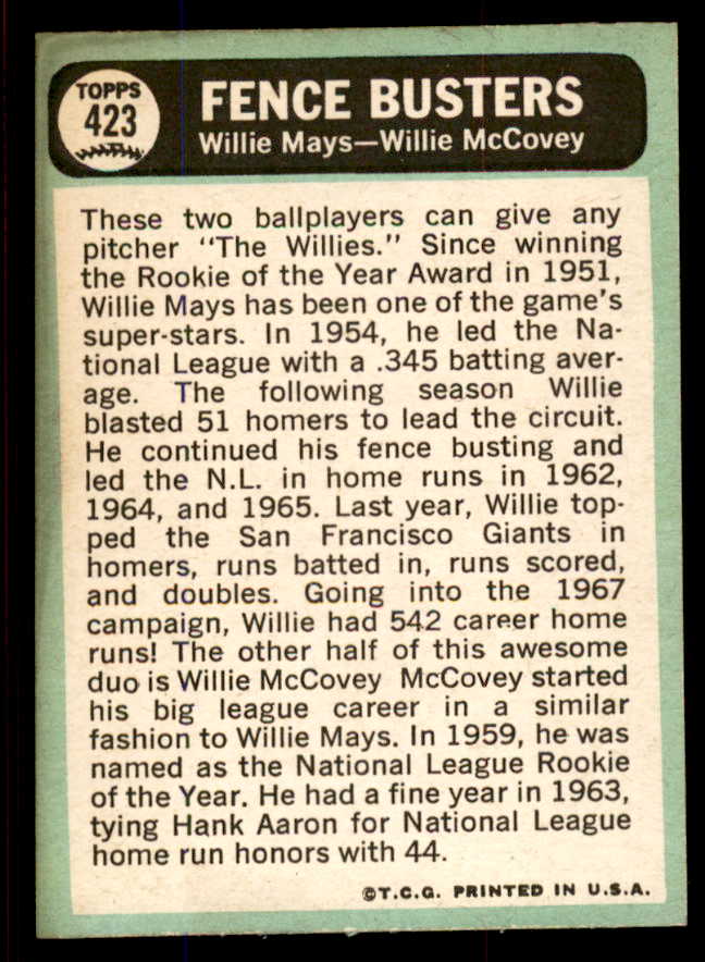1967 Topps Baseball #423 Willie Mays Willie McCovey VG-EX 545400