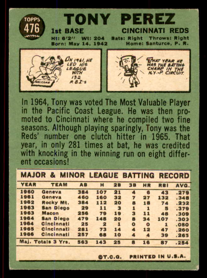 1967 Topps Baseball #476 Tony Perez Reds VG-EX 545799