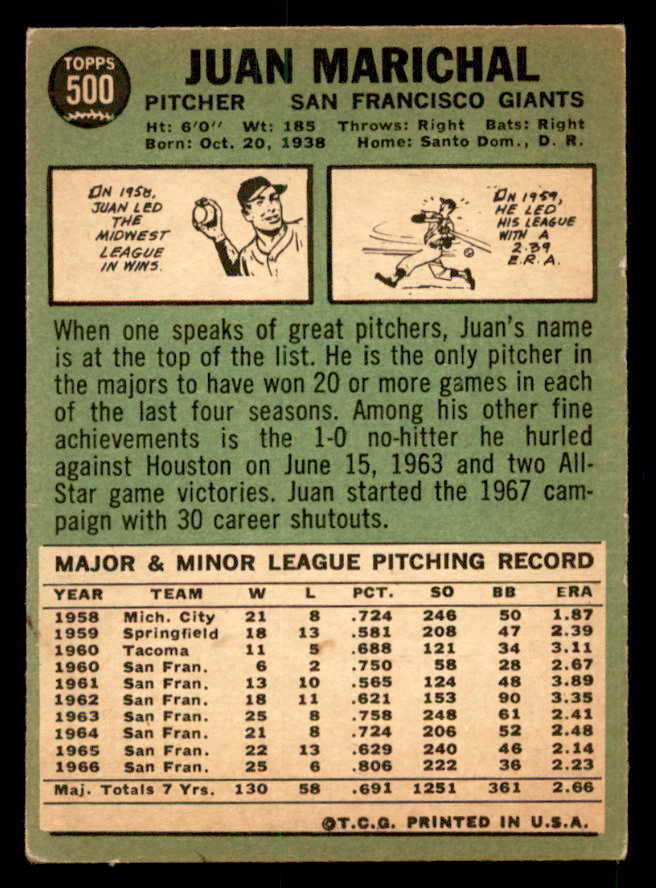 1967 Topps Baseball #500 Juan Marichal Giants VG-EX 539796