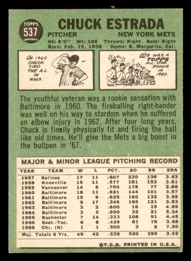 1967 Topps Baseball #537 Chuck Estrada Mets NR-MT 542951